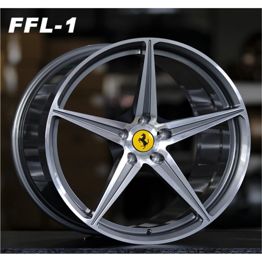 Кованые диски для Ferrari 458 в цвете глянцевый серый с алмазной проточкой лицевой части спиц. Классический дизайн. Комплект разноширокий и может использоватья с заводской центральной заглушкой (ступичный колпачек).